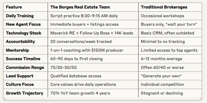 New agents on structured teams close first deals 3x faster than solo agents. Unlike most teams that restrict new agents to buyers only, The Borges Real Estate Team gives agents exposure to both buyers and listings from day one.